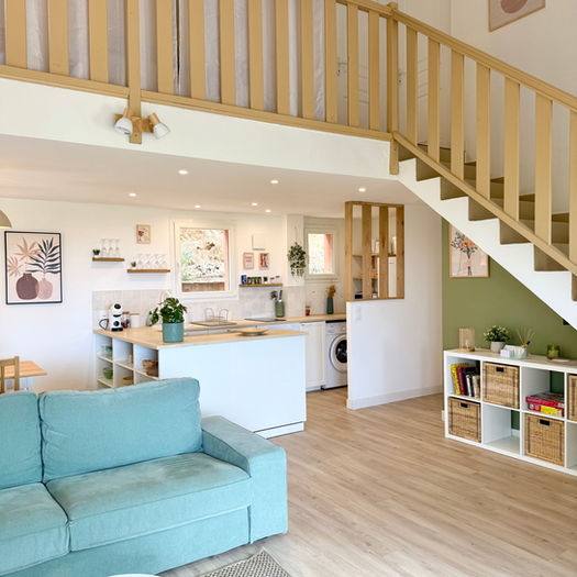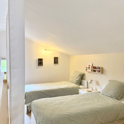 A mezzanine for children overlooking the living room, with two 90 × 200 cm beds, books, games and toys, plus curtains to separate it from the lounge.